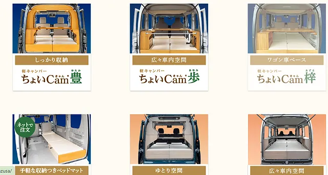 シンプル装備でお手頃価格の軽キャンパー「ちょいCam」は、1人で、またはご夫婦で楽しむ写真、登山、釣りや旅行に、ちょうどいいサイズの一台です